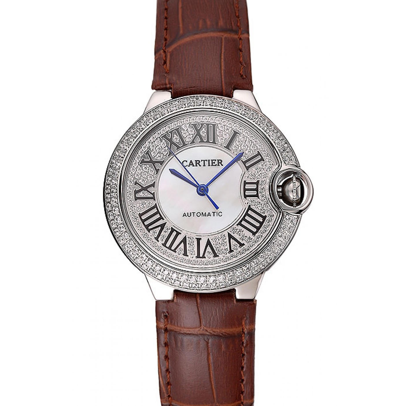 Swiss Cartier Ballon Bleu 46 MM Diamond Dial Diamond Case Brown Leather Bracelet 1453895