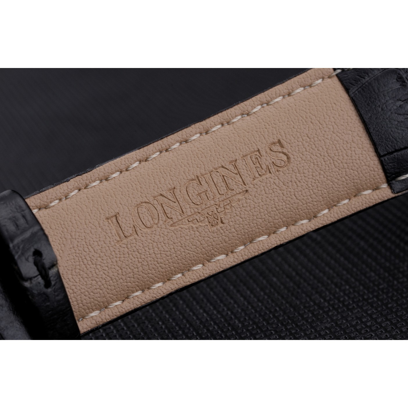 Bracelet Longines heat embossed black crocodile leather strap with Longines and logo inscribed polished stainless steel hook clasp