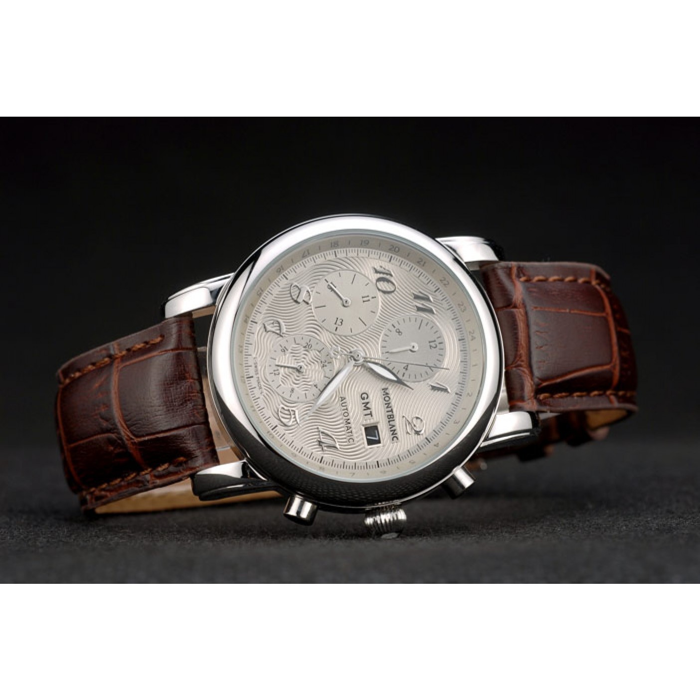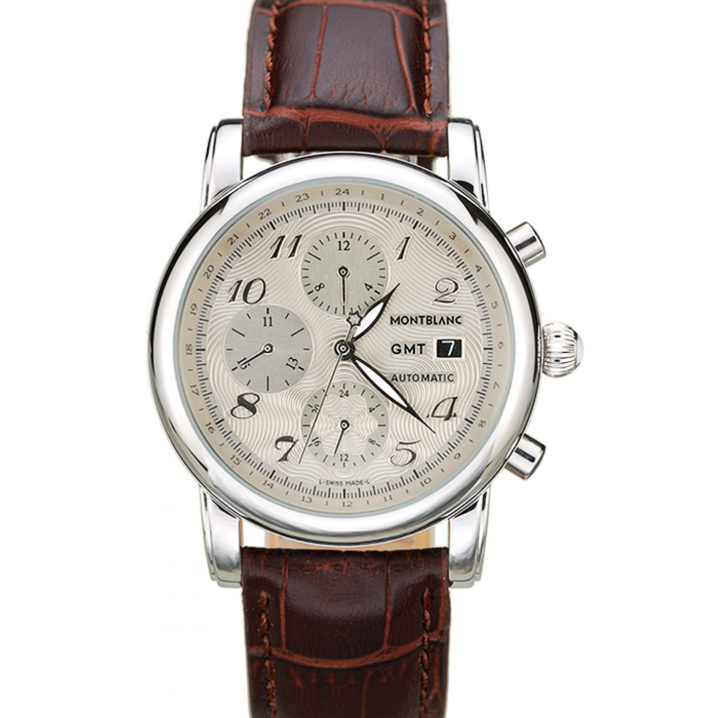 Crown Polished stainless steel rounded cutwork crown with MontBlanc logo and two polished stainless steel push button crowns on either side of it