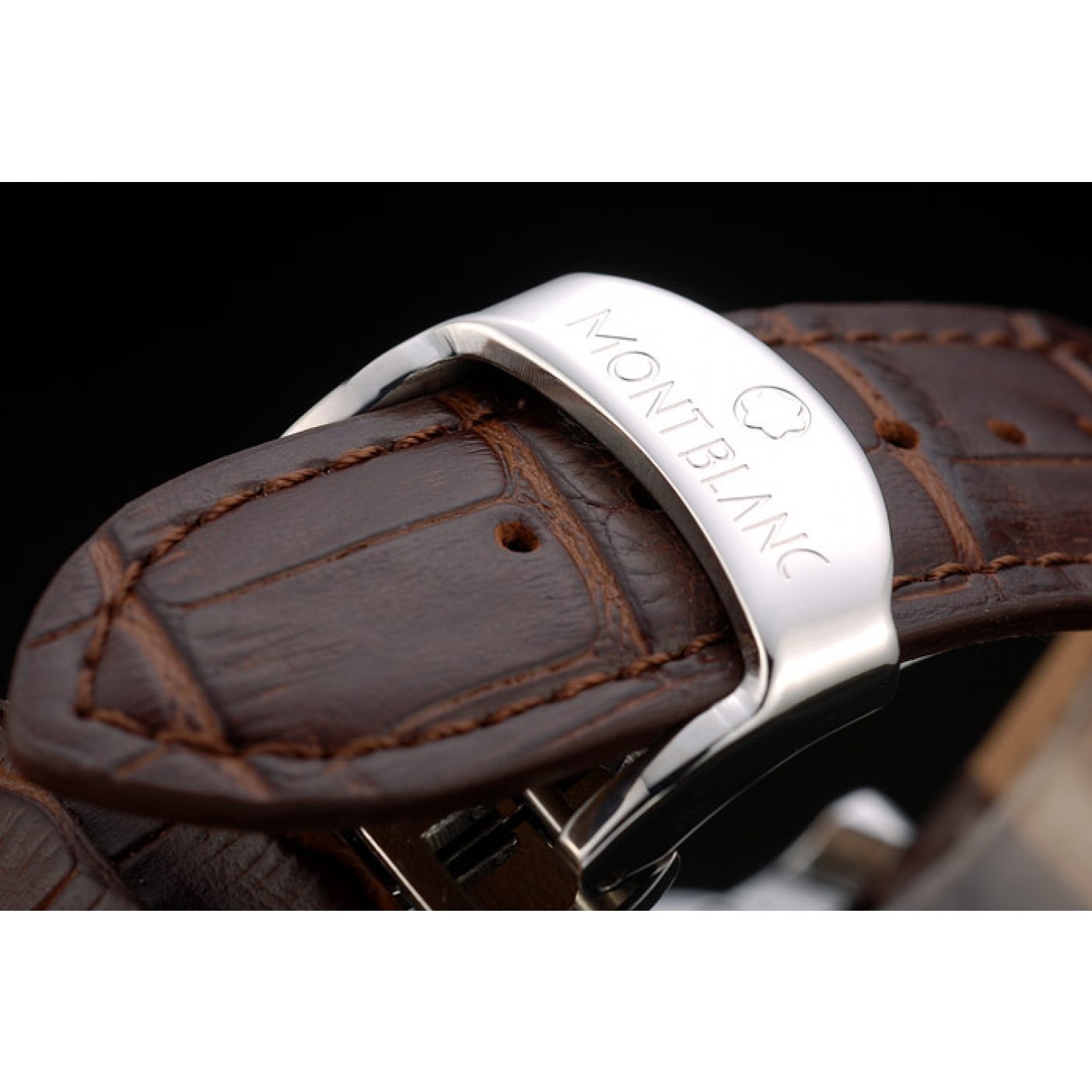 Bracelet MontBlanc heat embossed brown crocodile leather strap with MontBlanc and logo inscribed polished stainless steel hidden hook clasp