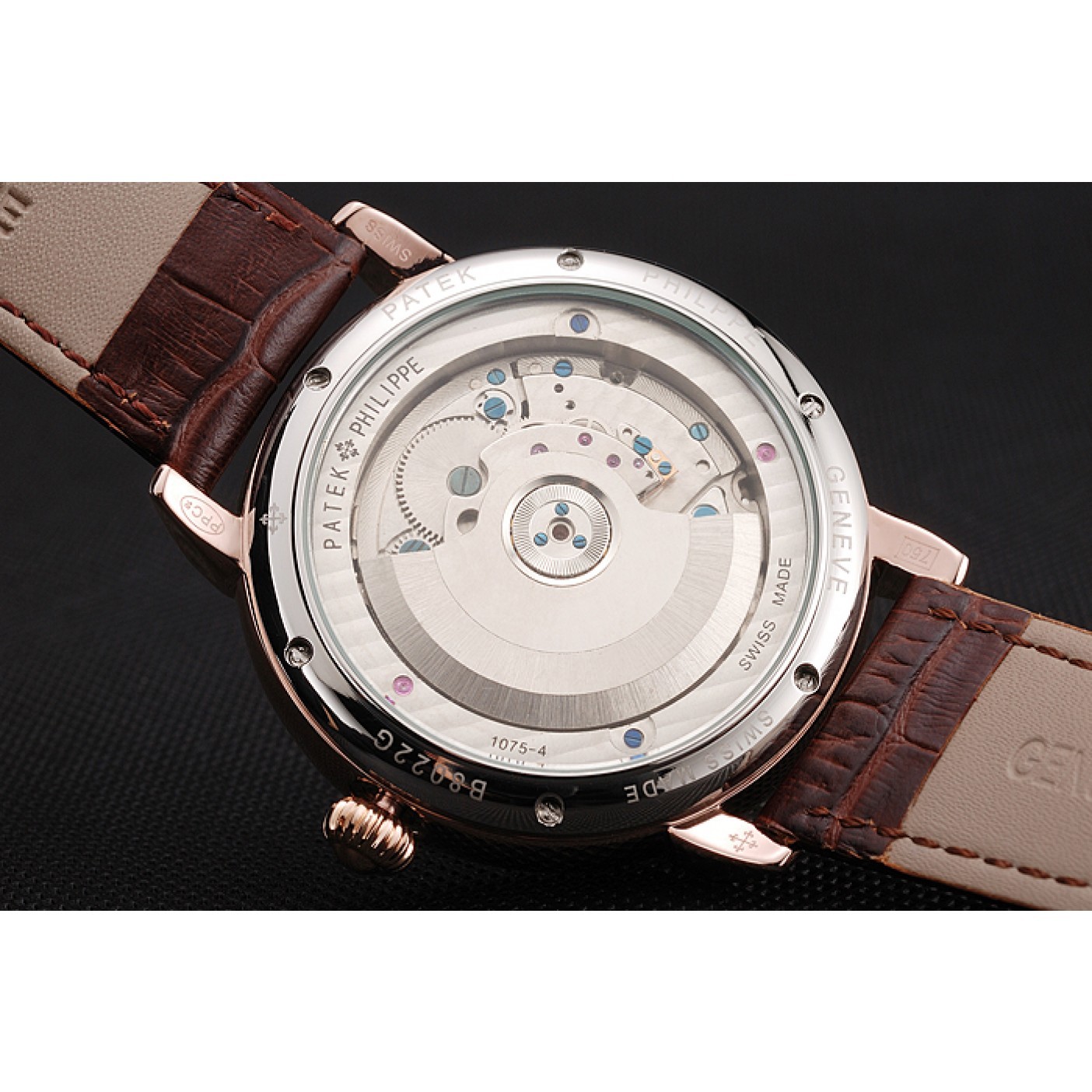 Back Polished stainless steel rimmed screwed down back with transparent mechanics revealing center and Patek Philippe engravings